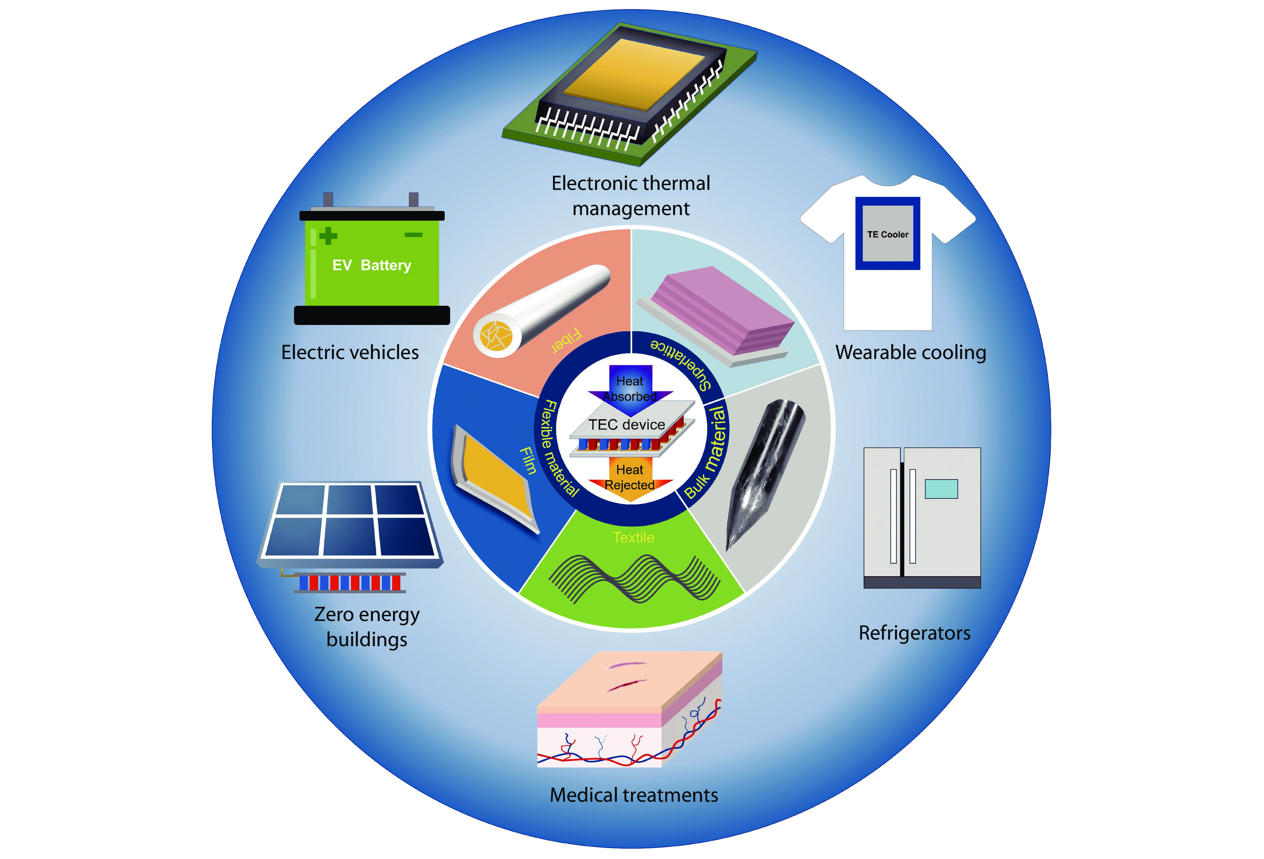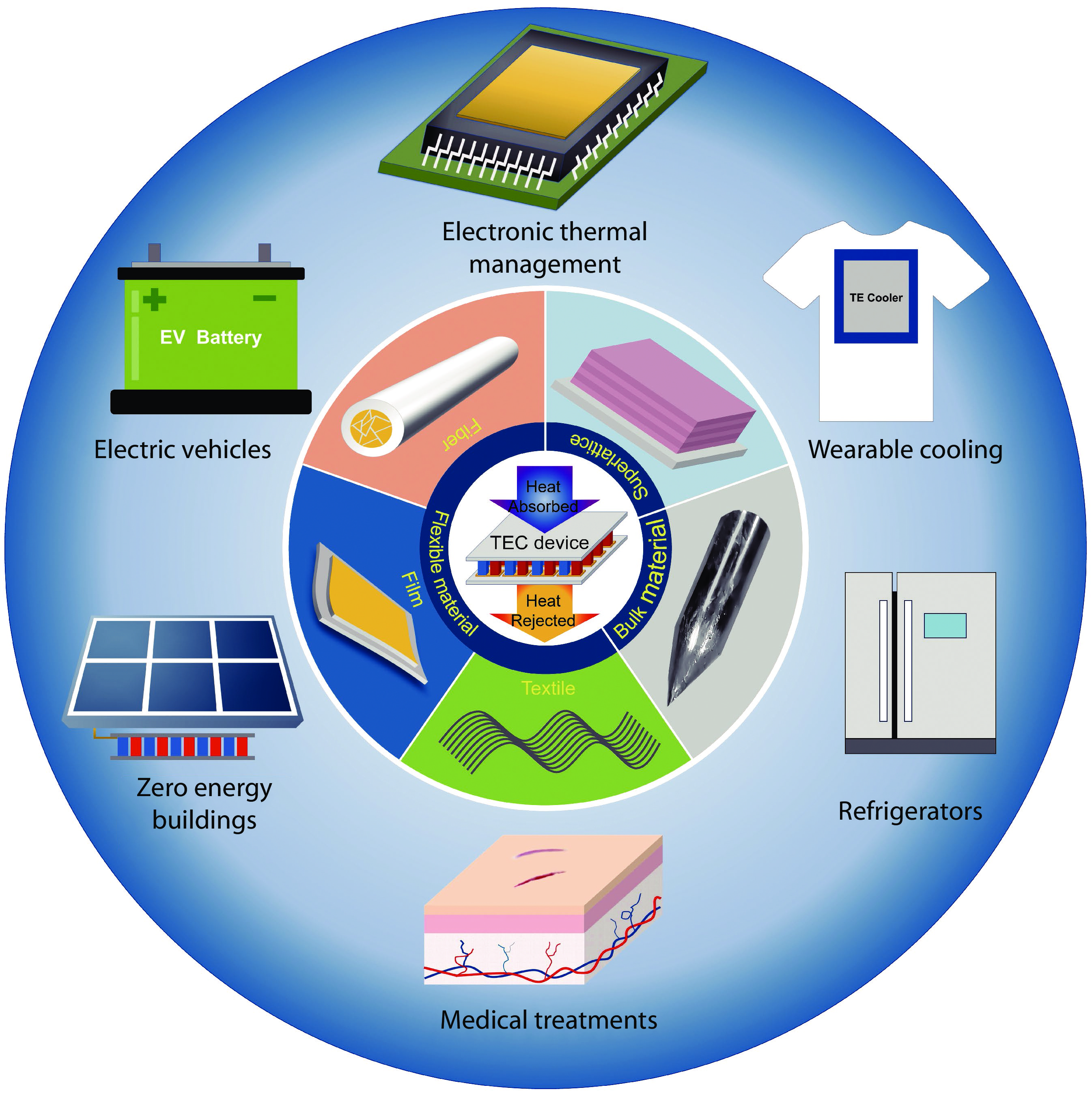 Schematic diagram of TEC materials, devices, and their manifold applications in different fields, typically including electronic thermal management, electric vehicles, zero energy buildings, medical treatments, and civil applications (mainly including refrigerators and wearable cooling), etc.