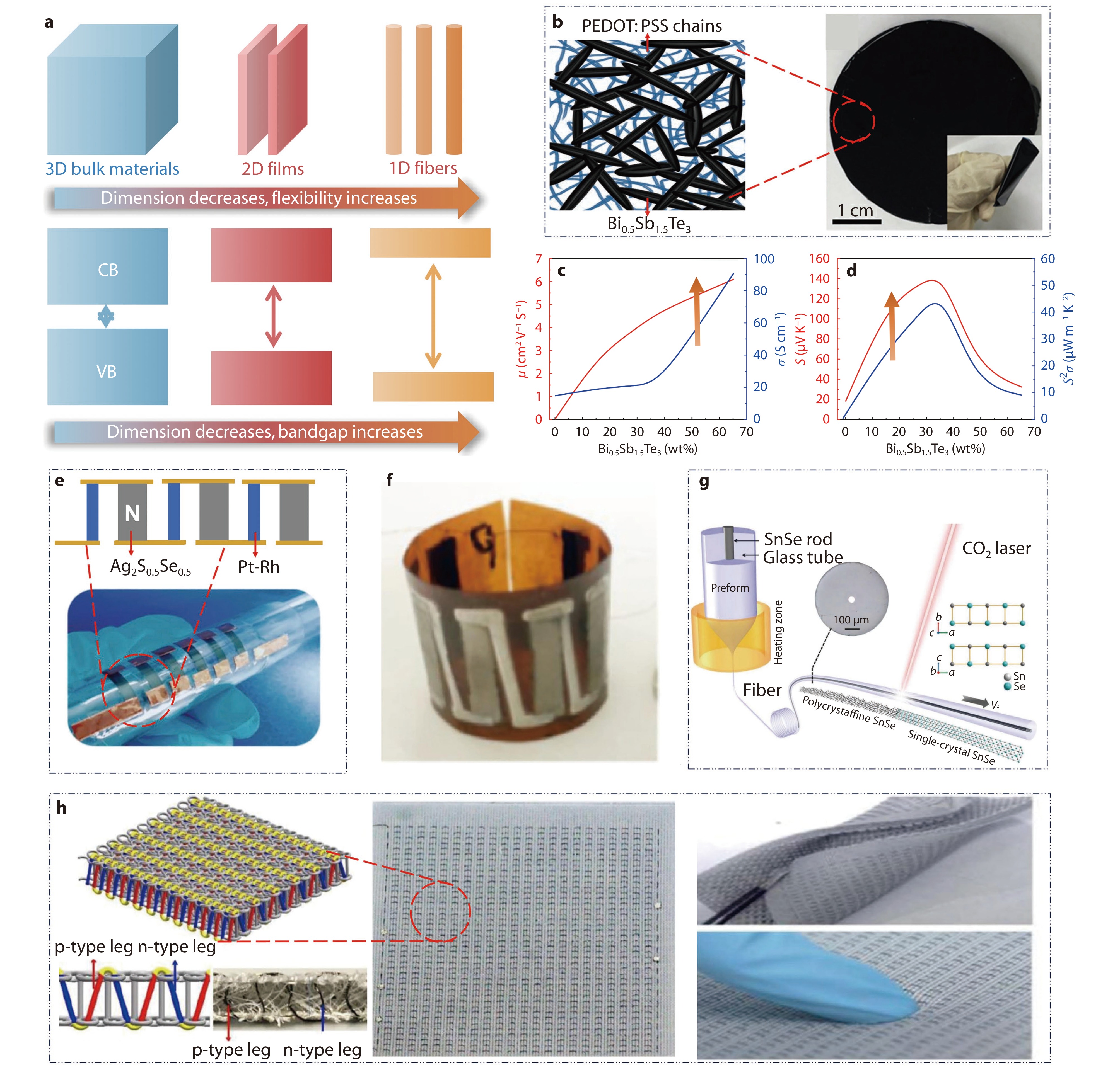 a Schematic diagram of quantum confinement effects; b Bi0.5Sb1.5Te3/PEDOT: PSS-based flexible thermoelectric film; c-d Room-temperature electrical transport properties of PEDOT: PSS film before and after adding Bi0.5Sb1.5Te3 filler.[117] Copyright 2020, Elsevier; e Fabricated full-inorganic thermoelectric device.[118] Copyright 2019, Royal Society of Chemistry; f A prototype flexible device composed of thick films.[119] Copyright 2018, Elsevier; g SnSe fiber fabrication and morphology.[114] Copyright 2020, Wiley; h The textiles made from warp-knitted spacer fabric in their as-prepared state, exhibiting admirable flexibility.[120] Copyright 2020, Royal Society of Chemistry.