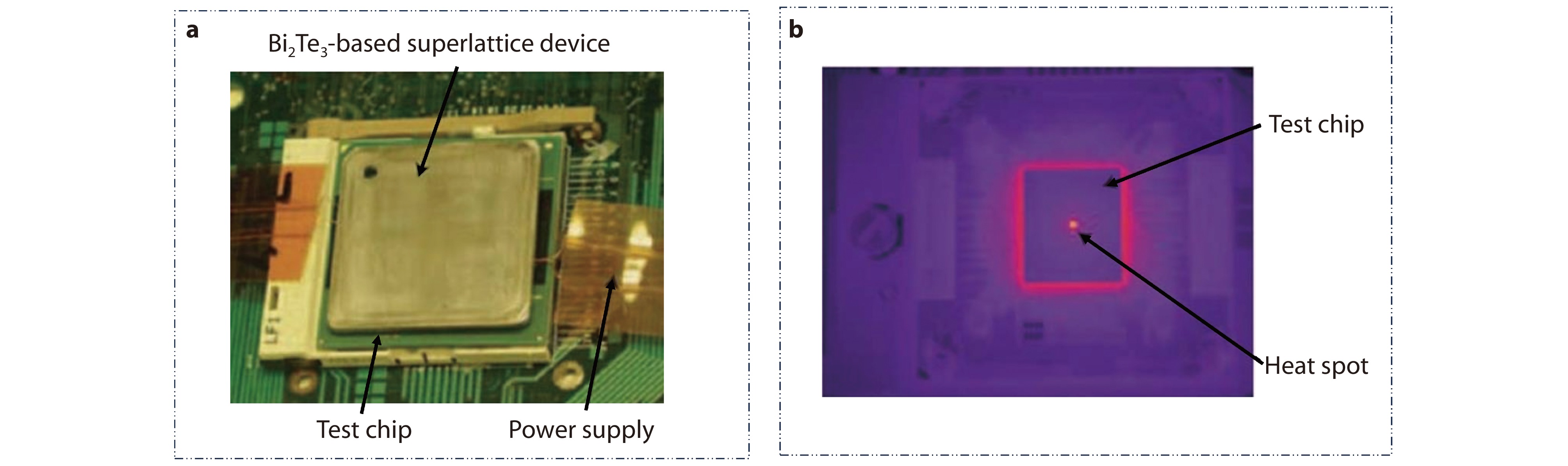 a Picture of Bi2Te3-based superlattice device used for electronic thermal management. The TEC device is powered by wires on both sides and installed on the test chip; b The operational infrared photos of both the electronic chip and TEC device reveal that, except for the hot spot, the entire section of the chip covered by TEC device exhibits comparatively lower temperature, suggesting that TEC effectively dissipates heat flow generated by the electronic device.[125] Copyright 2009, Springer Nature.