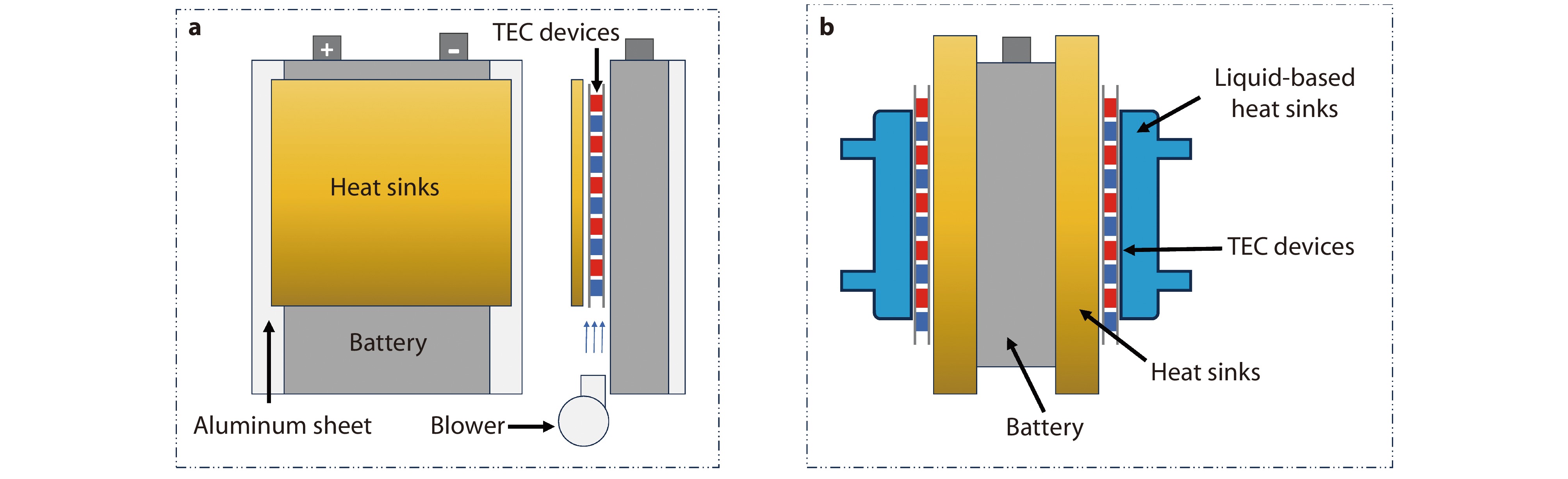 Schematic diagram of TEC-based BTMS integrated with a air cooling[130] and b liquid cooling[129], respectively.