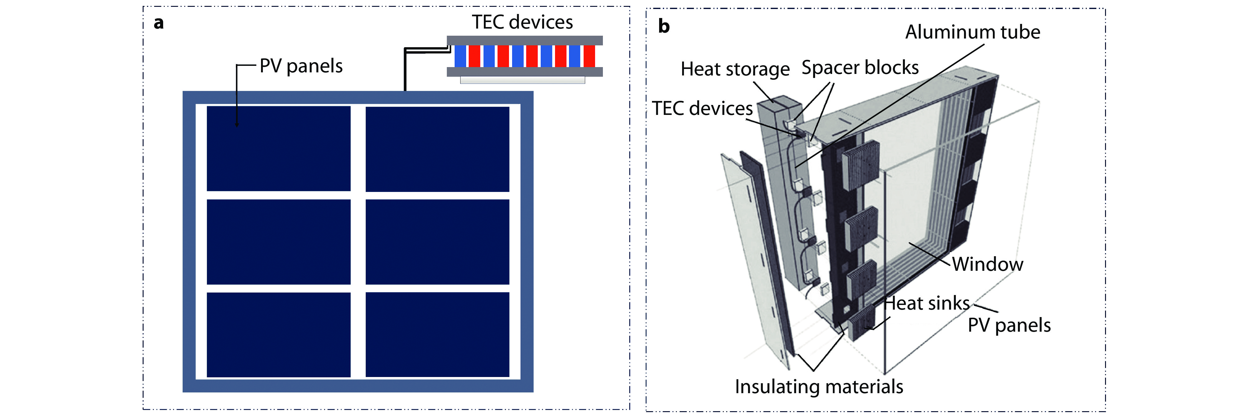 Schematic diagram of a active building wall[135] and b active building window[136] with the integrated PV and TEC technologies.[136] Copyright 2008, Elsevier.
