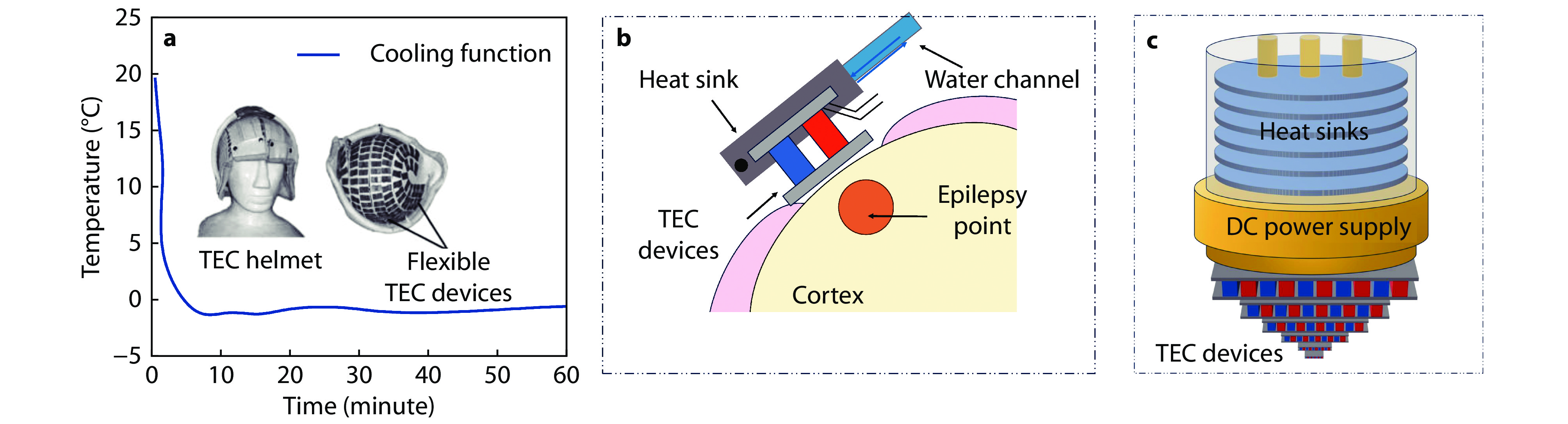 a The cooling temperature of the TEC helmet as the function of operating time, with the insets showing the TEC helmet and its inner structure.[143] Copyright 2008, Taylor & Francis Group; b Schematic diagram of TEC device for treating epilepsy;[146] c Schematic diagram of a cryoprobe for cryosurgery. DC: direct current.[147]