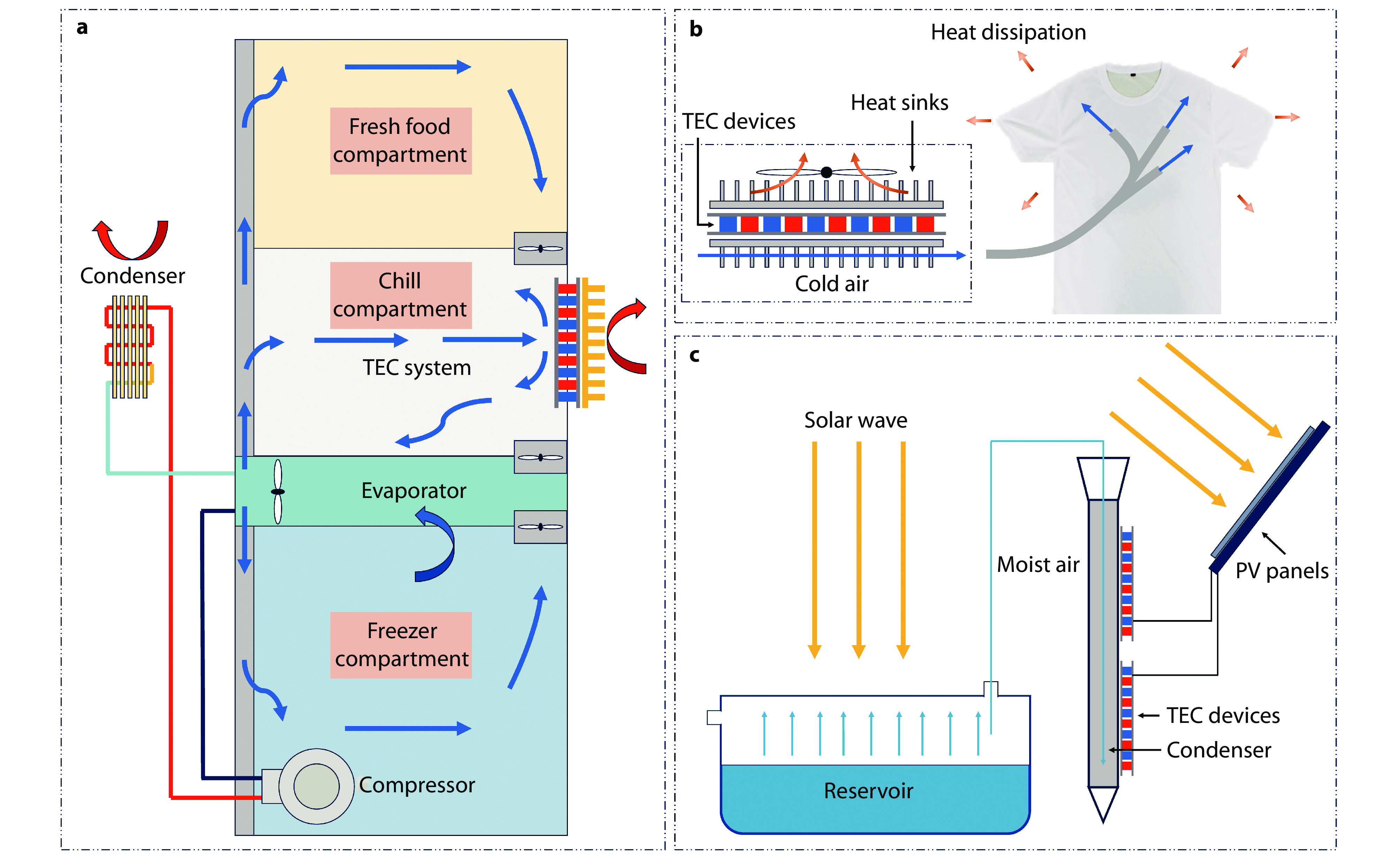a Schematic diagram of TEC and vapor compression hybrid refrigerator. The compressor played a crucial role in the refrigeration cycle by compressing the refrigerant. During this process, the refrigerant undergoes evaporation and condensation, which enables it to absorb and release internal heat. In order to further enhance the refrigeration efficiency, a TEC system has been installed in the chill compartment, which is located between the fresh food and freezer compartments. This innovative system rapidly dissipated the heat generated by the upper and lower compartments to the environment. As a result, the overall cooling efficiency of the hybrid refrigerator was significantly improved;[152] b Operational schematic diagram of personal thermal management using TEC-based underwear;[153] c Structural schematic diagram of TEC-PV integrated freshwater generator.[154]