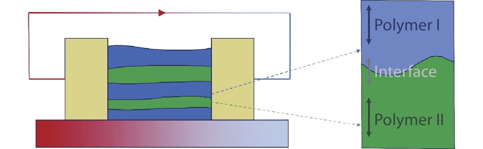 Schematic of the PMHJ film for thermoelectric power generation, with the enlarged right image showing the layered structure with PDPPSe-12 depicted in blue and PBTTT shown in green, respectively. Here, symbol in PDPPSe-12:PBTTT signifies a film that has been processed in a sequential, repeating pattern. The layers of PDPPSe-12 and PBTTT were interconnected using a linking agent possessing four branches, each branch equipped with azide moieties, ensuring a robust and stable film structure. Figure redrawn from reference.[4]