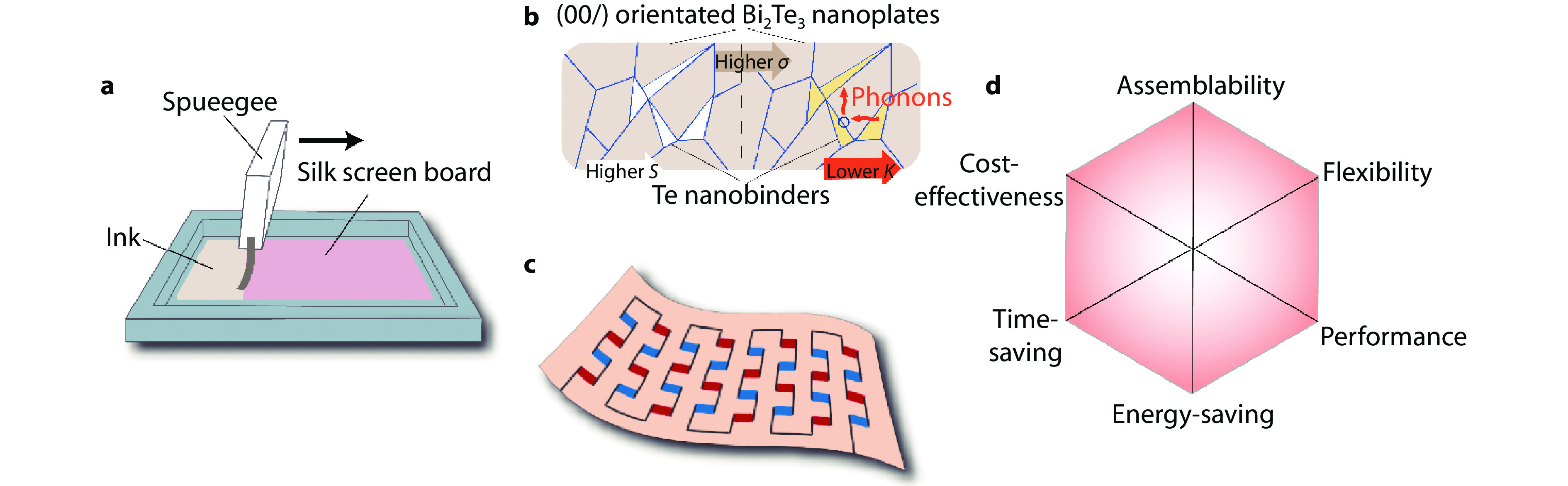 a Schematic diagram illustrating the screen-printing process. b Structural illustration of screen-printed Bi2Te3 thin films, highlighting their (00l)-oriented alignment and morphology. c Structure of screen-printed flexible thermoelectric device. d Conceptual schematic depicting the constructed flexible thermoelectrics as analogous to a "hexagonal warrior".