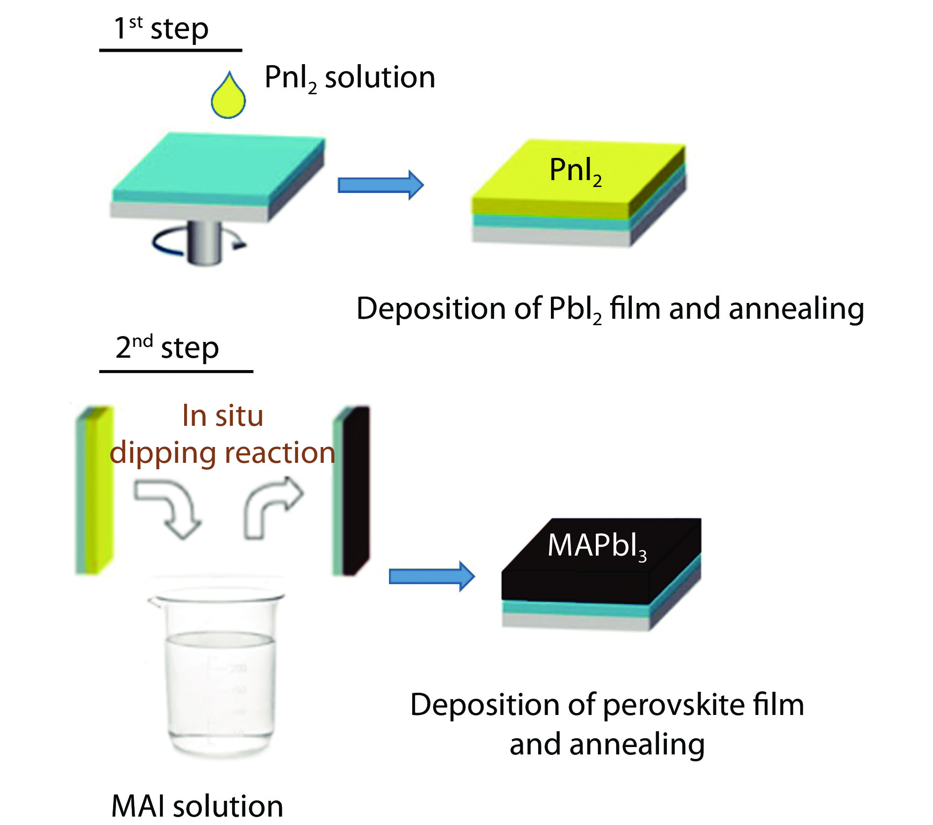 Schematic representation of the two-step sequential deposition method, that was used for the deposition of perovskite layer.