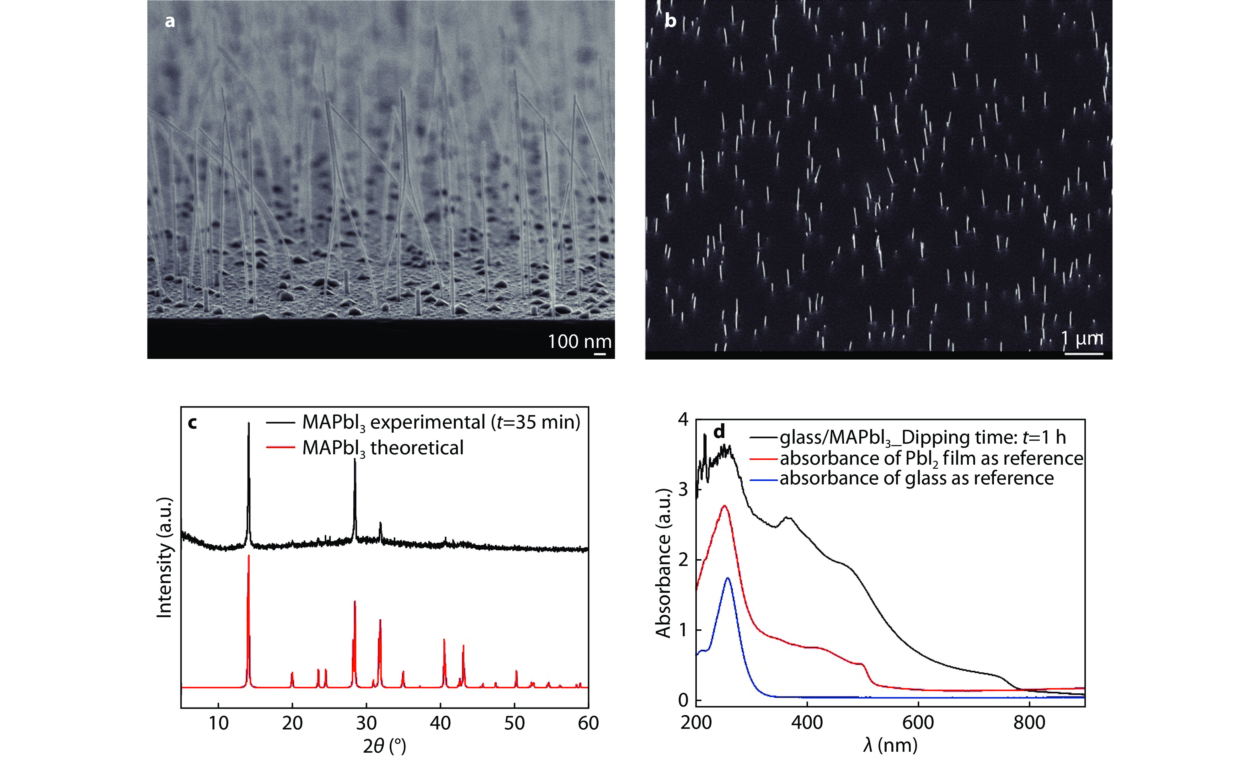 a, b SEM images of the as-grown GaAs NWs in cross-plane and near-vertical view, for undoped NW structures (see NW composition in figure 1c), before and after the deposition of BCB layer on nanowire structures, respectively. c XRD pattern of the CH3NH3PbI3 perovskite film prepared on a glass substrate by the modified two-step sequential deposition method in comparison with the theoretical XRD pattern. Strong preferential orientation of the crystals is observed. d Absorption spectrum of the CH3NH3PbI3 perovskite film on soda lime glass.