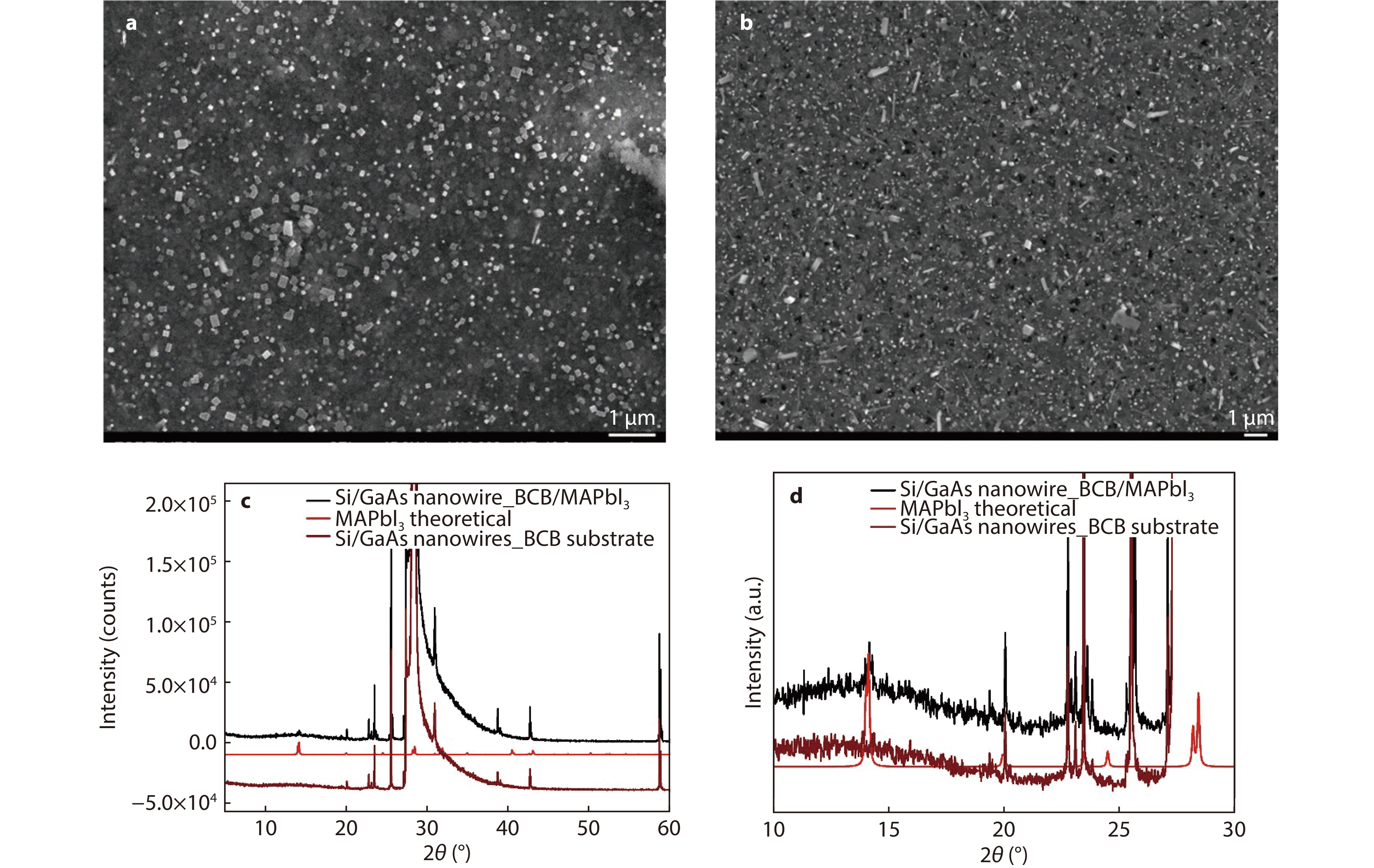 a, b SEM images of the CH3NH3PbI3/GaAs NW heterostructure for two different perovskite deposition conditions (30 min and 60 min dipping time, respectively). c, d XRD pattern of the CH3NH3PbI3/GaAs NW heterostructure indicating the formation of crystalline perovskite on top of the nanowires, evidenced by the reflection at ~ 14°. The overarching peak at 2θ = 29° results from the (111)-oriented Si substrate.