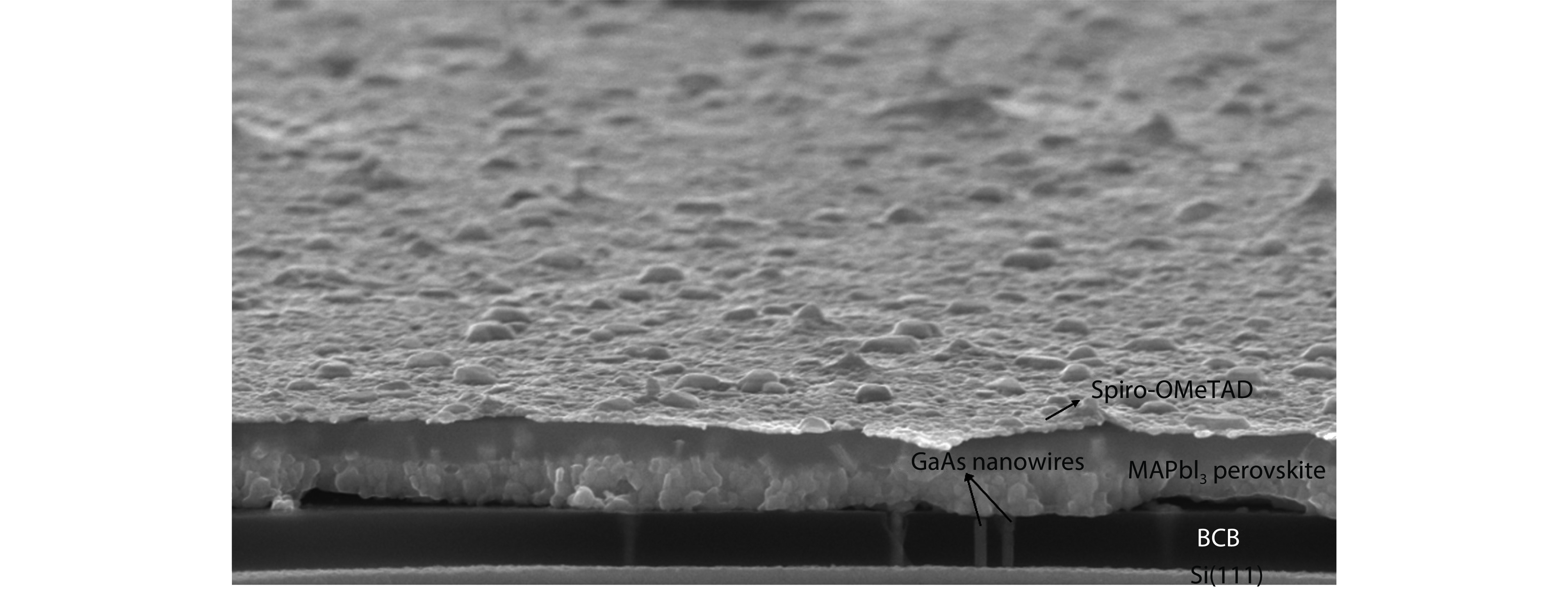 SEM image in cross-section for the diode device, in case of 1 h dipping time. The (circular) electrode layer is not included in the SEM image. In the SEM image, homogeneous deposition of perovskite layer on nanowire structures is revealed. GaAs nanowires are not apparent through the perovskite layer which is attributed to non-efficient cleaving of the diode device for taking the SEM image in cross-section.