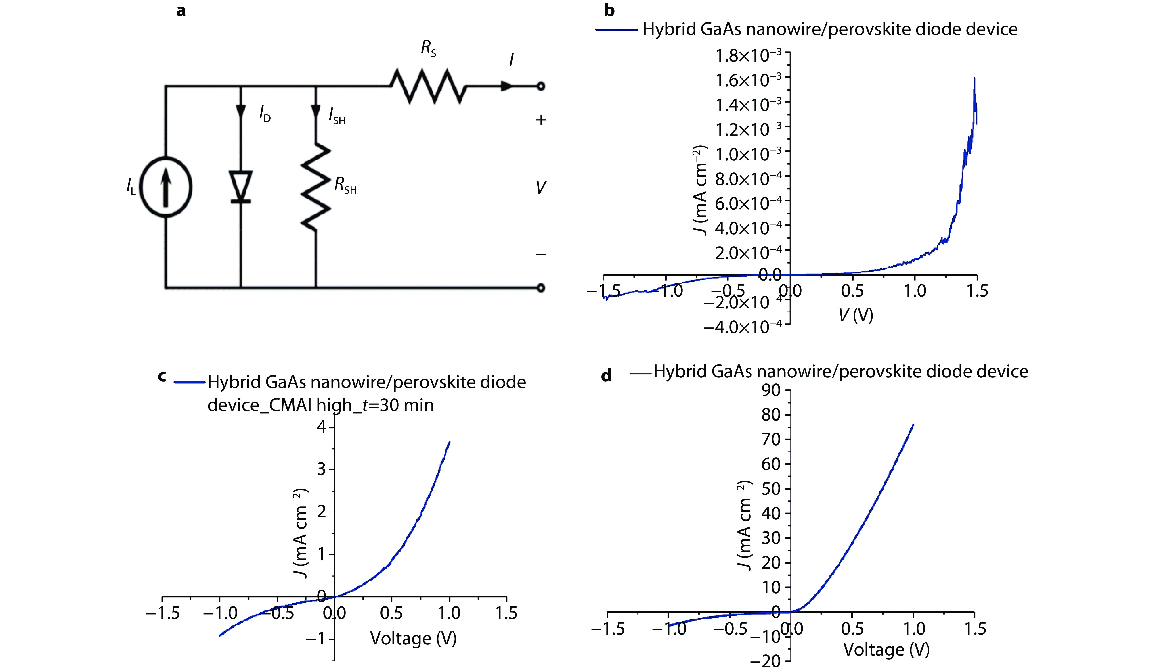 a Schematic representation of the equivalent electrical circuit of the CH3NH3PbI3/GaAs NWs heterojunction. b I-V characteristics of the diode between pristine GaAs NWs and CH3NH3PbI3. c, d I-V characteristics of the diode between doped GaAs NWs and CH3NH3PbI3 for two different perovskite deposition conditions (30 min and 60 min dipping times, respectively).