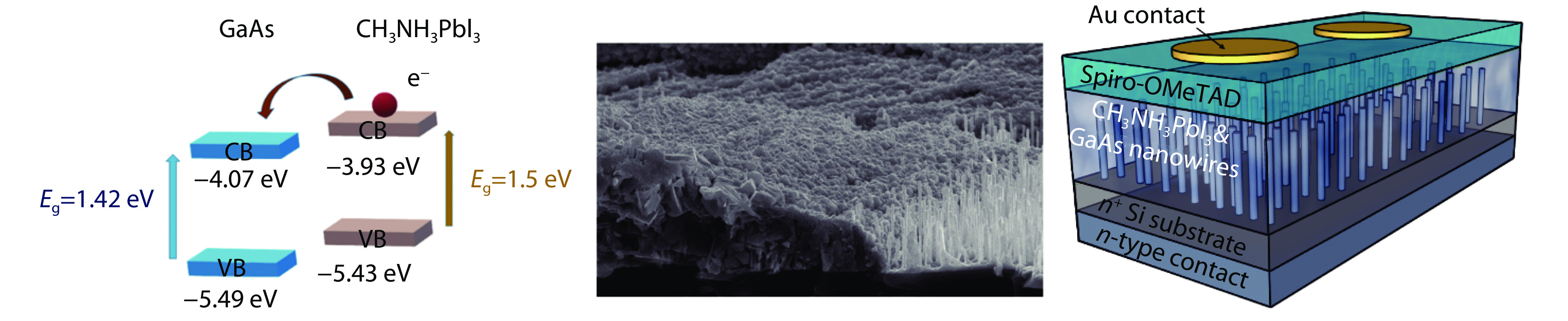 a Schematic representation of energy levels for GaAs and CH3NH3PbI3 perovskite, indicating favorable band alignment for electron transport between CH3NH3PbI3 and GaAs. b The device architecture. c Schematic representation of the composition of the GaAs nanowires in intrinsic and doped variants, respectively. In the case of doped nanowires, a thin 2D layer of GaAs is also deposited on the substrate during the deposition of the GaAs shell.