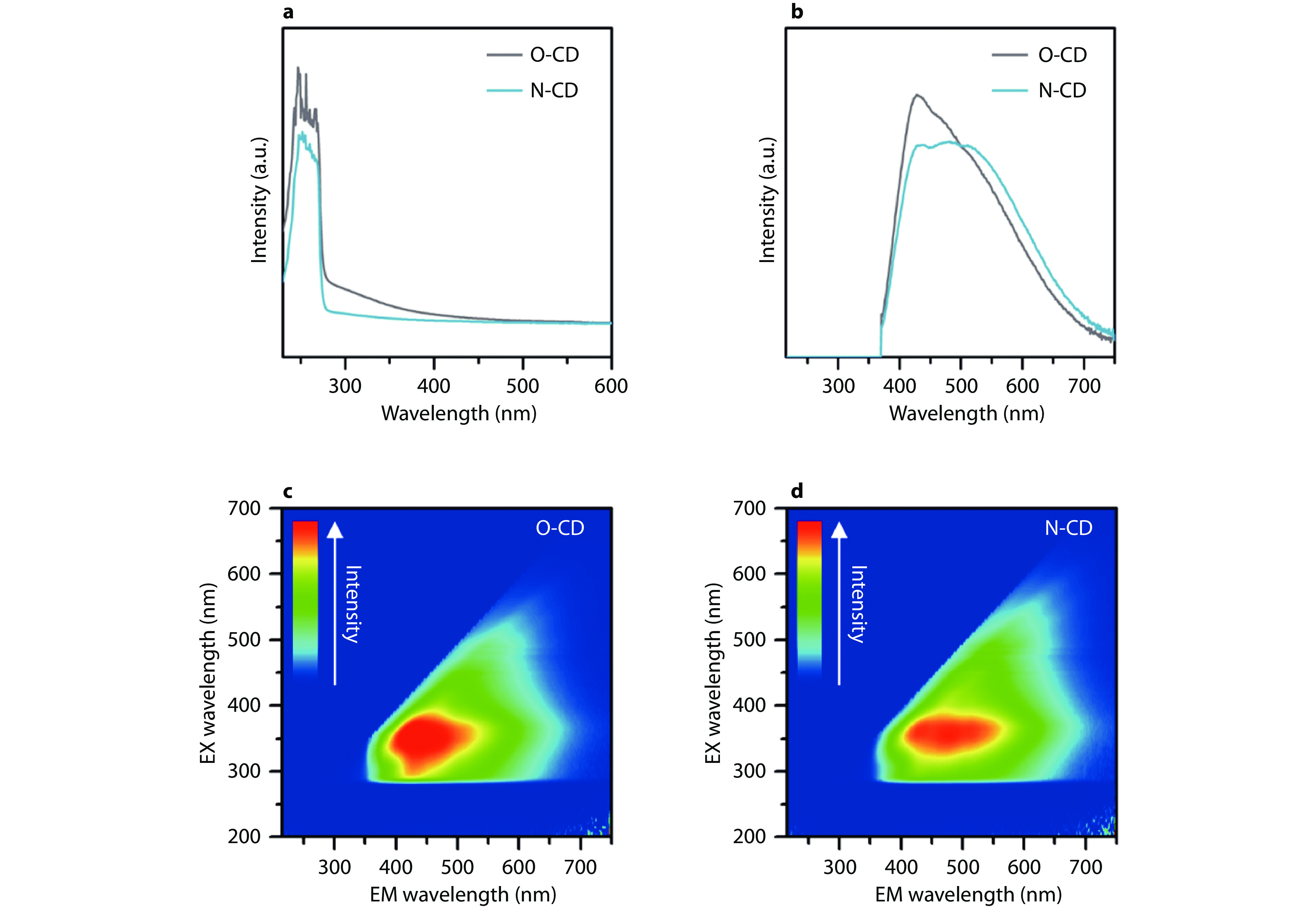 Optical analyses of the CDs. a ABS spectra of the CDs. b PL emission spectra of the CDs. PL emission contour maps of c O-CD and d N-CD. EX and EM in the axis titles refer to excitation and emission, respectively.