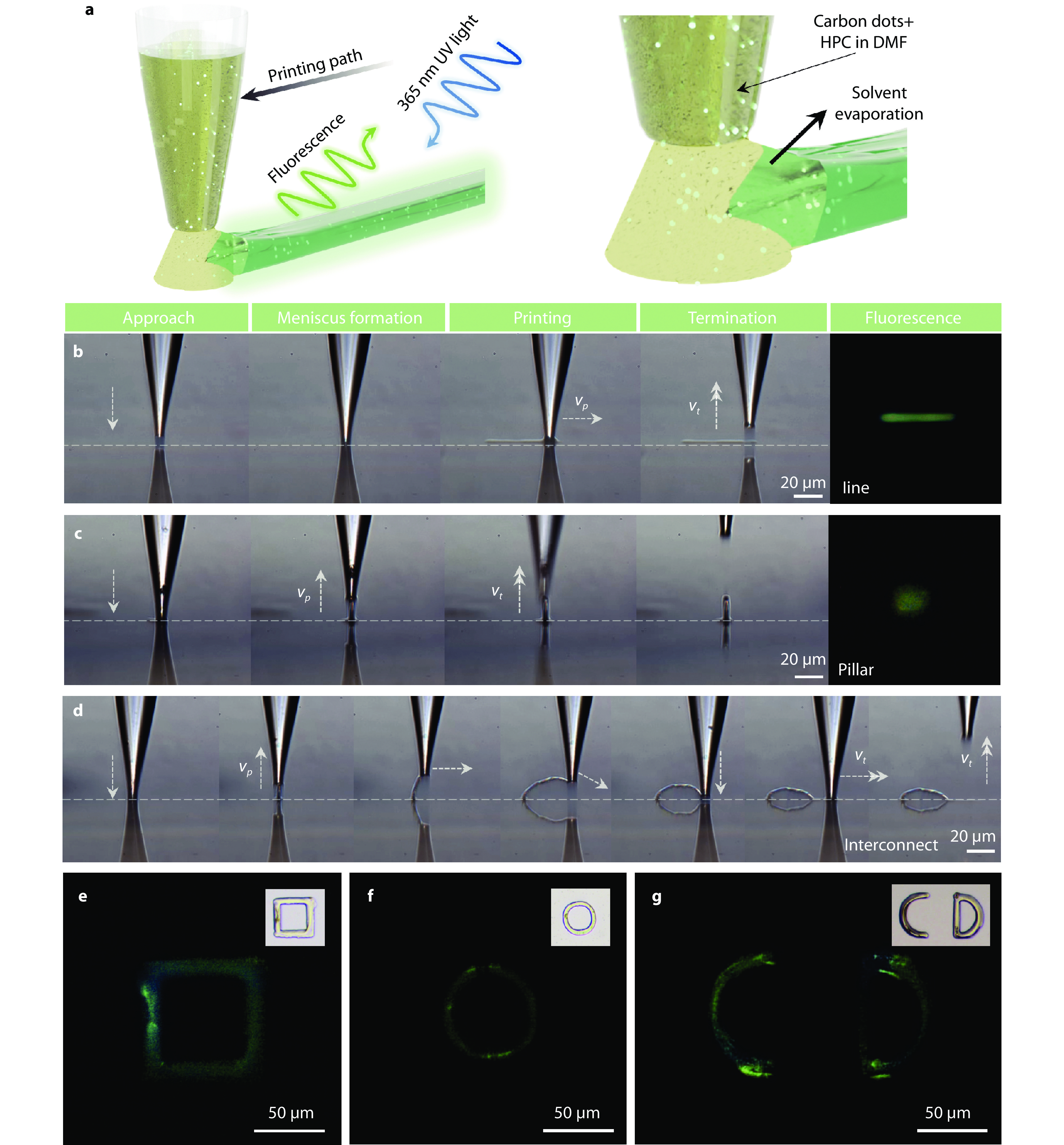 Meniscus-guided micro printing of the CD-filled ink and printing techniques. a Schematic of printing and fluorescence in printed patterns under UV light. b-d. Various printing techniques for printing of b line, c pillar, d interconnect and their fluorescence images. e-g Printing applications for writing a plane figures and alphabets using continuous layer-by-layer printing method.