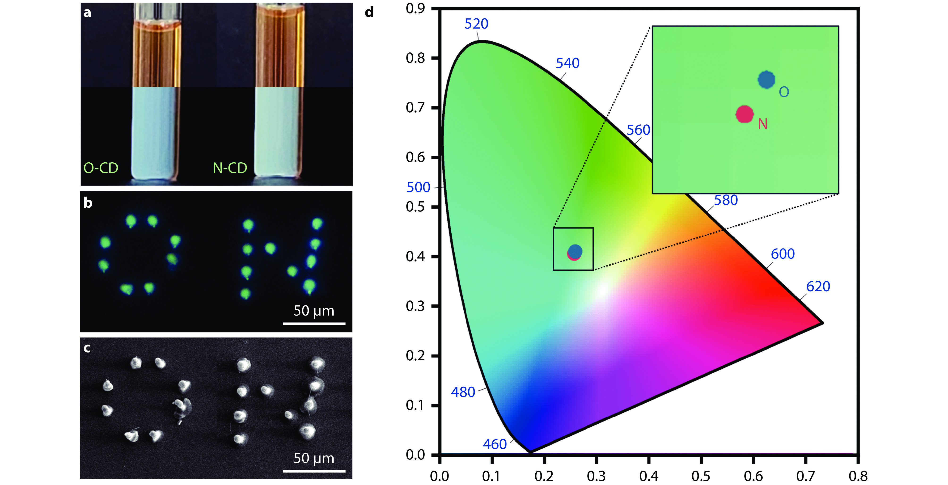 a Optical images of the O- and N-CD-filled inks under daylight and 365 nm UV light. b Optical images of the printed CD ink and comparison of fluorescence colors of the pillars filled with O- and N-CD. c SEM image of the letter “O” and “N”. d CIE chromaticity diagram of color coordinates of O- and N-CD fluorescence colors.