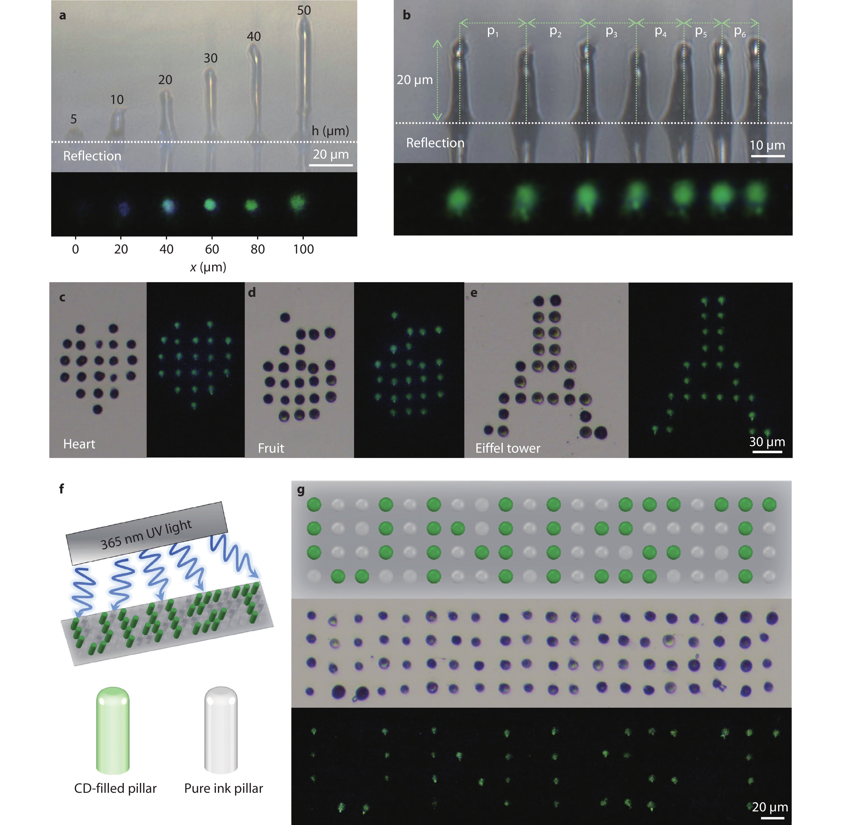 Printing application using pillar structures. a Side-view optical image comparing the brightness at different pillar heights. b Optical side-view image of pillars arranged at varying intervals (p1: 20 μm, p2: 17.5 μm, p3: 15 μm, p4: 12.5 μm, p5: 11.25 μm, p6: 10 μm). c-e. Fluorescence images of different patterns c heart, d fruit, e Eiffel tower. f Schematic of information encryption method using CD-filled pillars and pure ink pillars under 365nm UV light. g Encrypted image of the text “UNIST”.